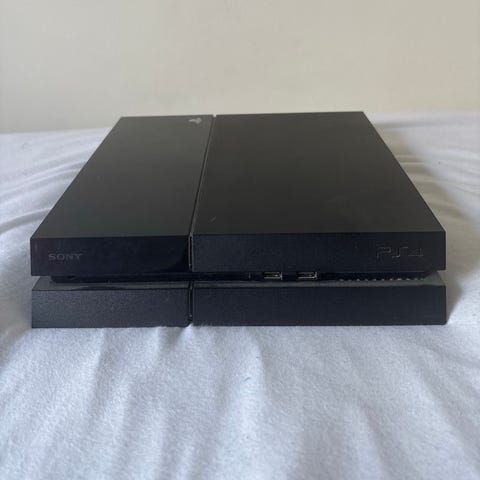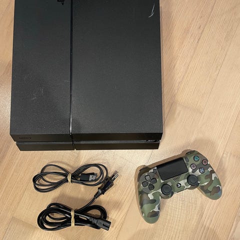 Sony Playstation 4 konsol i sort. Konsollen leveres med strømkabel og to sorte DualShock 4 controllere. Egnet til spil, streaming og underholdning for én eller flere brugere.