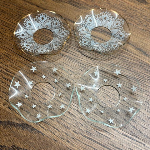 lysmachetter i glas i forskellige former og farver. Samlingen omfatter både klare og farvede glasmanchtter herunder blå, ravfarvede, røgfarvede og mørke nuancer. Former varierer fra runde til firkantede og bølgede kanter. Lys manchetterne er velegnede til kronelys eller små stearinlys og kan anvendes enkeltvis eller samlet som dekoration på bord eller hylde. Designet er med fokus på enkelhed og variation i glasudtryk.