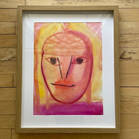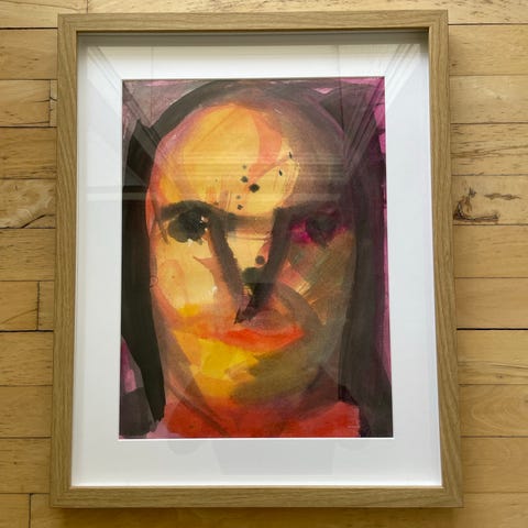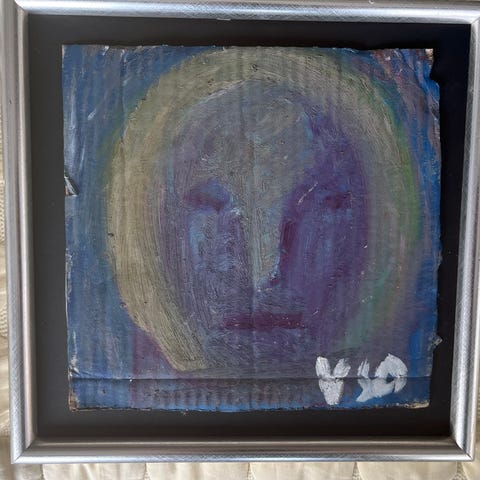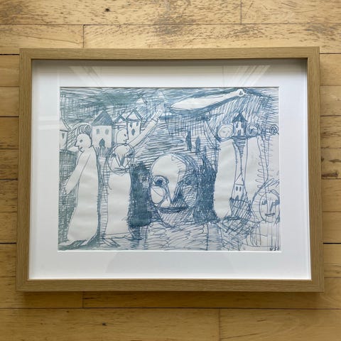 Denne tegning i oliekridt udstråler en særlig råhed og stoflighed, der er typisk for hans mest energiske og umiddelbare værker. Det er et klassisk Skotte-motiv med de velkendte figurer og det lille hus, holdt i en enkel og tidløs streg. De blå nuancer og de lette, hvirvlende cirkler skaber en fin dynamik, der giver masser af karakter til væggen. Et enkelt og ærligt værk, der rummer hele essensen af hans univers.