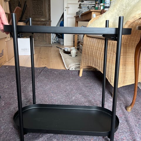 Sort konsolbord i metal med enkel, rektangulær metal ramme og en ekstra hylde under bordpladen. Bordet har et let og åbent design, der egner sig til brug i entré, stue eller som afsætningsbord. Overfladen fremstår glat og ensfarvet, og konstruktionen består af en slank metalramme med plane hylder.