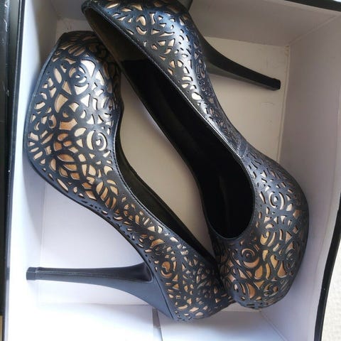 Pumps i sort læder, åben i tå.