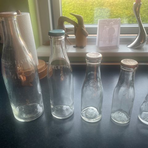 Gamle mælke- og flødeflasker med låg. 2 sæt med hhv 1/1, 1/2, 1/5 og 1/10 liter + en lille medicinflaske med mål, 7 cm høj.