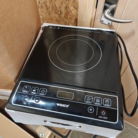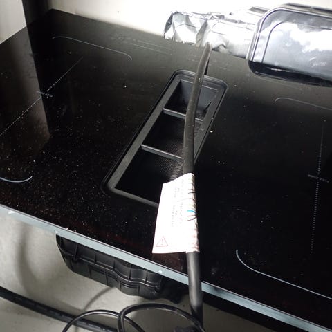 Kogepladen har glaskeramisk overflade med markerede kogezoner. Undersiden viser integrerede køleventilatorer og fastmonteret tilslutningskabel til elinstallation. Velegnet til køkkener, hvor der ønskes en plan og rengøringsvenlig kogeplade med induktionsteknologi.