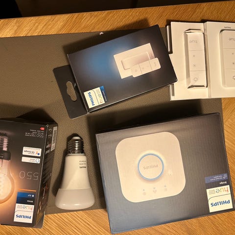 Philips Hue White startpakke med smart belysning. Sættet indeholder to E27 LED-pærer på 1100 lumen i varm hvid samt en Hue Bridge. Systemet understøtter styring via Bluetooth og Zigbee og kan betjenes gennem Philips Hue appen på både iOS og Android. Pærerne kan dæmpes og indgå i automatiseringer via Hue Bridge, f.eks. tidsplaner og fjernstyring. Velegnet til almindelige E27-fatninger i hjemmet, hvor der ønskes integreret smart lysstyring.