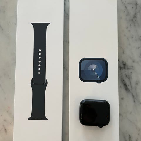 Apple Watch Series 9 GPS 45 mm aluminium med sort nylonrem. Uret har en digital skærm og understøtter trådløs opladning via medfølgende opladerkabel. Batteriets maksimale kapacitet er 96%.