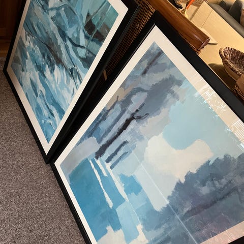 De er monteret i original ramme med passepartout og glas. Der er skrevet 'ejerforhold' på bagsiden.