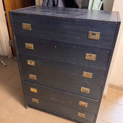 Fin, ældre kommode i lyst laminat. Brugt, men stadig meget brugbar. Det ene håndtag er knækket (se billede). Kan evt. upcycles. Hentes i Bellinge, Odense SV