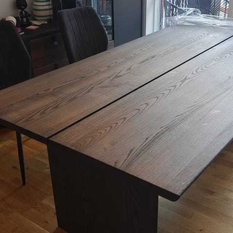Timber planke spisebord i moccabrun olieret ask, skrå kant og 2 planker plus 6 stole fra Ilva til salg for 7000 kr (ny pris 21499kr). Små brugsspor, men vil se ud som helt nyt efter en omgang olie. Kom gerne med et bud