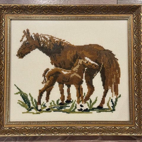 Korstingsbroderi af "et kobbel heste udenfor Lindenborg Kro".