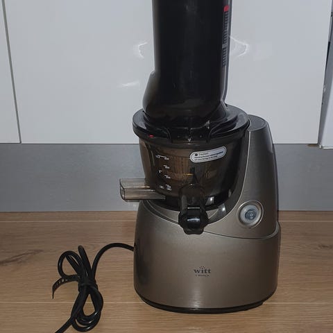 Witt saftpresser i sort. Med tilhørende beholdere og tilbehør som vist på billedet, herunder opskriftsbog og brugsanvisning. Egnet til fremstilling af juice af frugt og grøntsager i husholdningen.