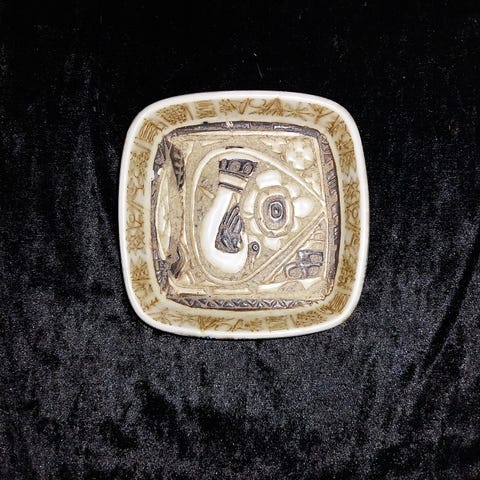 Royal Copenhagen fajance fad i firkantet form med let afrundede hjørner. Fadet har blå og grøn dekor med fuglemotiv og plantemønster på lys bund samt mørkeblå kant. Undersiden er stemplet med Royal Copenhagen Denmark Fajance mærke og modelnumre. Velegnet som serveringsfad eller dekorativt indslag i indretningen.