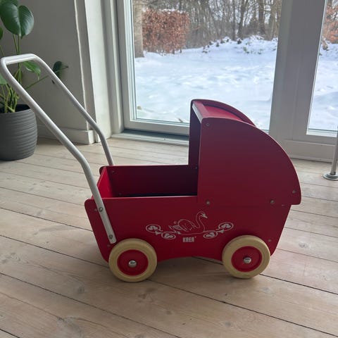 BRIO dukkevogn med kaleche i rød tekstil med stribede detaljer. Vognen har sort metalstel, fire hjul med lyse gummikanter og trådkurv under vognen til opbevaring. Indvendigt er der polstret liggedel med sengetøj, som kan bruges til dukker og bamser. Egnet til leg indendørs og udendørs