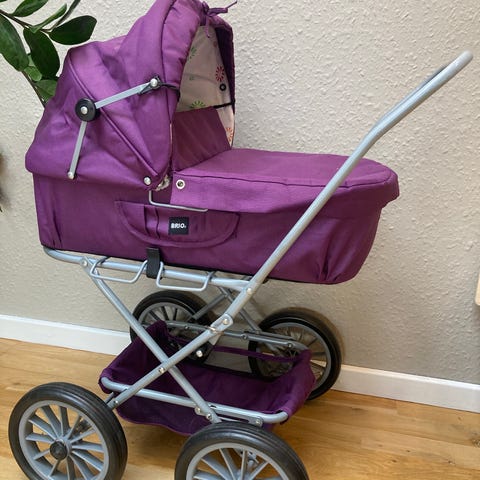 Ældre BRIO dukkevogn. Stoffet er lidt falmet, men ellers kører den godt, Hjulene larmer ikke. Kurven under vognen har lidt rust.