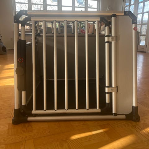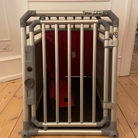 4pets ProLine hundebur i aluminium med rød crashpad. Buret er konstrueret i stabile aluminiumsprofiler og sider, der giver en robust og sikker transportløsning til hund i bil. Fronten har lodrette tremmer og låge, der kan åbnes for nem ind- og udstigning. De afrundede hjørner og faste sider er designet til at passe ind i bagagerum og beskytte både hund og bilens indretning. Velegnet til transport af mellemstore hunde, ca 20 kg hund. Mål: højde 67cm bund dybde: 93 udvendigt, bredde 54,5 udvendig. Indvendige mål: H 63cm D: 84,5 B: 48cm. TÜV godkendt og testet et kvalitets bur fra Schweiz nok et af det bedste der er. Skramler og larmer ikke i bilen.