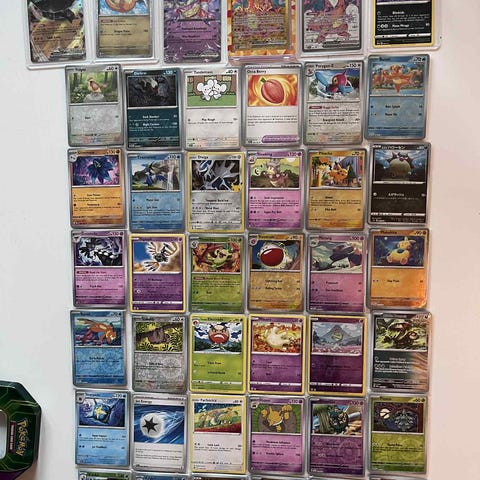 Pokémon samlekort mappe med forskellige kort. Indeholder en blanding af Pokémon-kort og energikort i plastlommer samt en mindre metalkasse med ekstra kort. Egnet til samlere eller som udgangspunkt for en samling af Pokémon samlekort.