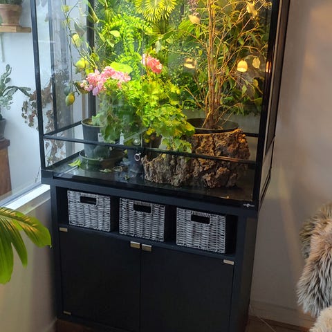 Terrariereol med 3 stk. 60x60x80 cm terrarier. Inkl. Dyser og inkl. Lys.. Der er 6 x dyser i hvet terrarium, og syrefast og helt fint fluenet. Det står i reol lavet af porsa. Der er limet baggrund i, som er godt til planter når det vandes. Dræn i bunden på dem alle. Lidt små skavanker et par steder men fuld funktionsdygtigt. Bytter ikke. Useriøse henvendelser frabedes. Der er dyser for 2000 kr alene. Kan bruges til øgler, farvefrøer, geckoer, slanger mm. Afhentes i Herning. Fragtes ikke. Fed dybde giver mulighed for at bygge op og plante en masse.