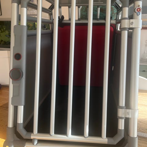 4pets Condor hundebur i størrelse L. Buret er fremstillet i aluminium og hård plast i sølvfarve. Konstruktionen har skrå sider, gitter foran med låge og lukkemekanisme samt lukkede sider og bagvæg. Ifølge mærkaten er de udvendige mål ca. 948 x 880 x 770 mm. Velegnet som transportbur til hund i bil eller som fast hvileplads i hjemmet. Buret står på plastfødder for stabil placering på underlaget. Indvendige mål er H: 66cm, D: 85, B: 74. Til en mellem til stor hund. Et af de beste bure på markedet, det er Schweizisk kvalitet, står stabilt og godt i bilen og larmer / skramler ikke.