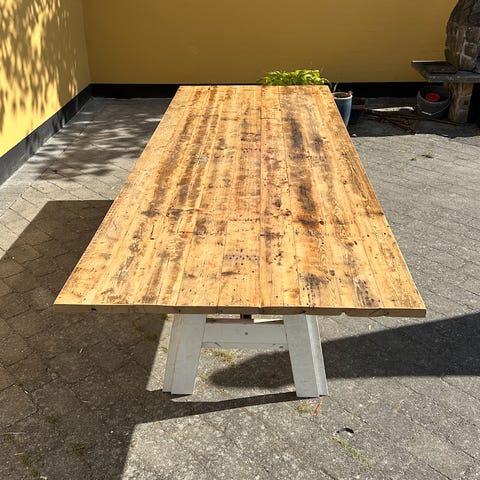 Bordet fremstår meget robust og stabilt med kraftige, lige ben og en massiv bordplade – perfekt til både hverdagsbrug og større middage.