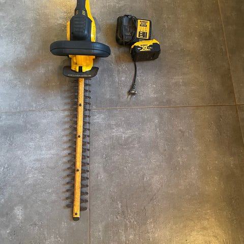Dewalt græstrimmer batteridrevet. Trimmeren har langt skaft og bærerem. Der medfølger batteri og oplader, som ses på billederne. Velegnet til trimning af græs og kanter i haven.