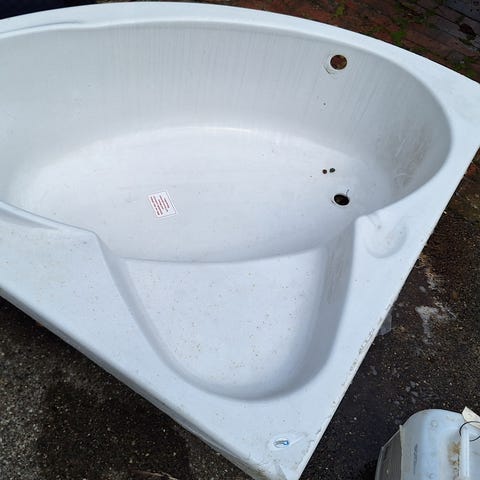 Hvidt badekar i hjørnemodel med afrundede kanter. Badekarret er fritstående mod væg og egnet til montering sammen med vægarmatur og bruser. Overfladen fremstår glat og rengøringsvenlig. Velegnet til almindeligt brug på badeværelse, hvor der ønskes et kompakt badekar placeret i hjørne. Karret er glasfiber og monteret for 2 år siden men aldrig brugt. Mål: L140 B85 og i den anden ande 65cm. Nypris 3.500kr. Bemærk: KONTANT betaling da vi ikke har Mobilpay.