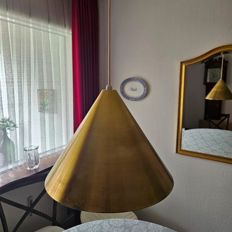 Original 1970’er metalskærm i rød med hvid underside, her genopbygget som bevidst hybrid med ny kronefatning og sort ledning. En grafisk og rolig loftpendel med direkte nedadrettet lys. Gennemgået og klar til brug. Egner sig bedst lavthængende i hjørne, entré eller over plante – ikke optimal som spisebordslampe pga. åbent lys.