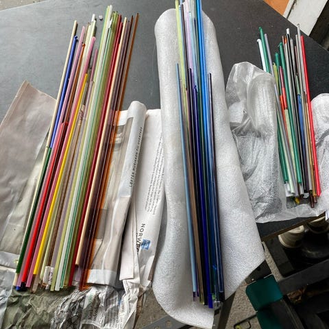 16 kg Glas, glasstænger til perle fremstilling bl.a og værktøj til glasarbejde