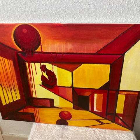 Abstrakt maleri opdelt i felter med motiver, der blandt andet omfatter figurer, bygninger og båd. Farvepaletten består primært af gule, hvide, sorte og grå nuancer. Maleriet har en moderne, grafisk komposition med både figurative og abstrakte elementer og er velegnet som vægdekoration i stue, kontor eller andre opholdsrum.