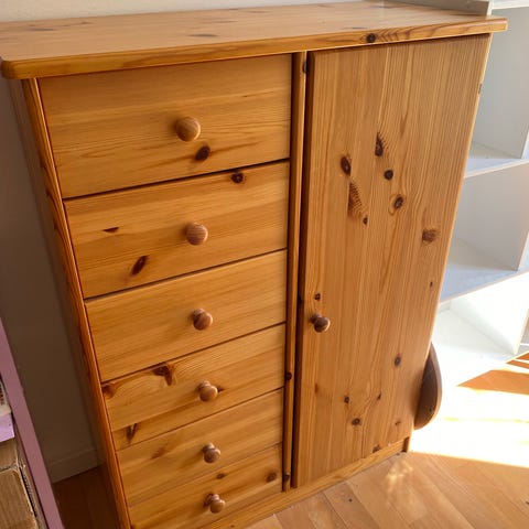 Reserveret til Ziga Gammel fyrretræ kommode med tre skuffer og nøgle fremstår stærk og funktionel dog er det ene håndtag knækket Men den fungerer fint alligevel skal sælges billigt og hurtigt Giv et bud jeg kan måske hjælpe med levering højde 74 cm bredde 87 cm dybde med håndtag 48 cm
