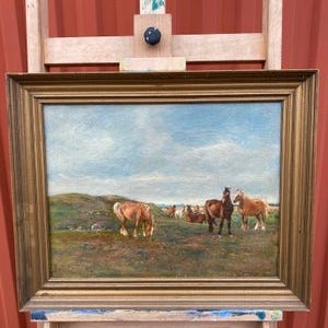 Oliemaleri af den danske kunstmaler Niels Christiansen (1873-1960) med landskabsmotiv forestillende køer på en mark under skyet himmel. Er indrammet i en brun træramme. Maleriet er signeret i nederste venstre hjørne: N Chr