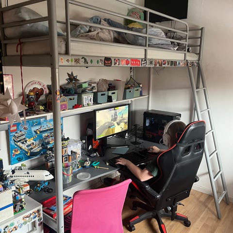 Her er hvad DBAs AI skriver: Sengen står på fire ben med stige i den ene side og sengehest hele vejen rundt. Under sengen er der god frihøjde, som kan bruges til fx skrivebord eller opbevaring. Lameller/bund med støttebjælke. Velegnet som juniorseng eller til ældre barn/ung, hvor der ønskes ekstra gulvplads under sengen.