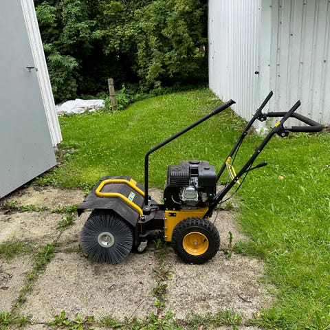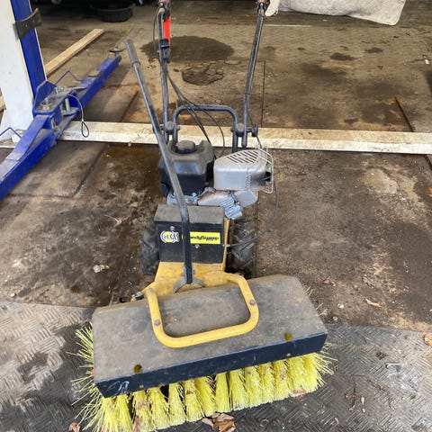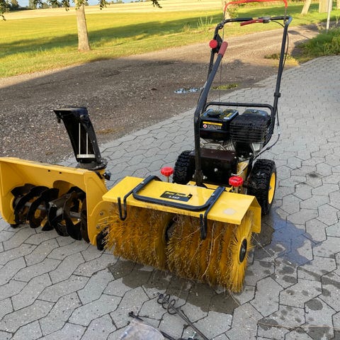 Texas Handy Sweep fejemaskine til udendørs rengøring. Benzindrevet kostemaskine med elstarter egnet til fejning af sne, grus og snavs på indkørsler, fortove og andre hårde underlag. Maskinen har roterende børste foran og håndtag med betjeningsgreb. Der medfølger ekstra børster og smådele som vist på billederne. Velegnet til brug omkring hus, gårdsplads eller mindre erhvervsarealer.