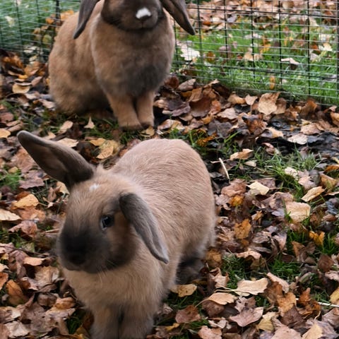 To lækre hun kaniner sælges enten samlet eller hver for sig. De er vant til at gå i gård med tre andre kaniner, så de skal helst have en ven der hvor de kommer hen. De er ude kaniner.
