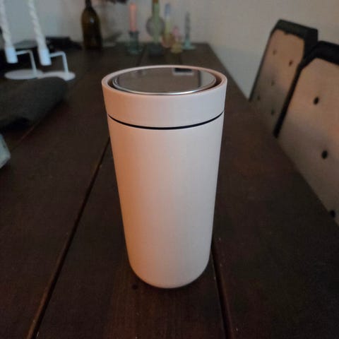 Stelton termokop i lilla. Koppen har dobbeltvægget konstruktion med inderside i metal og yderside i plast eller lakeret metal. Låget er skruelåg med drikkeåbning. Velegnet til varme 2 timer og kolde drikke 4 timer der skal holdes på temperatur under transport eller på farten.0,2 liter