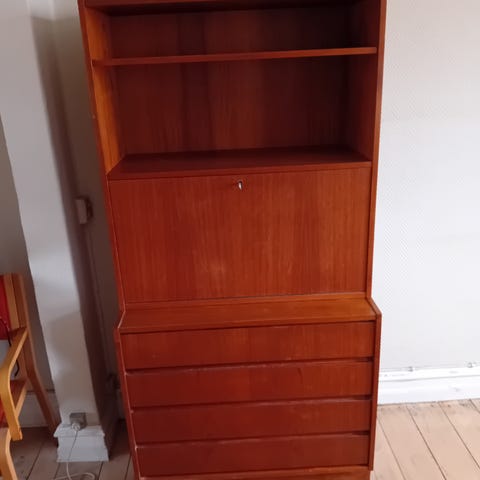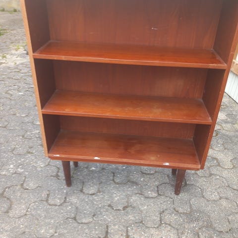 Reol i teaktræs finer med flytbare hylder. Reolen har synlige brugsspor da den er blevet brugt. Udover det fejler den ikke noget. 250kr eller kom med et bud.