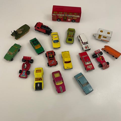 Sæt med flere små legetøjsbiler og lastbiler i blandede modeller og farver. Køretøjerne er fremstillet i en kombination af metal og plast. Alder på bilerne 10- 50 år. Udvalget omfatter blandt andet personbiler, lastbiler, racerbil og bjergningskøretøj. 2 mayorette biler. 3 biler matchbox. 4 biler Lesney. (Lastbil m hænger mangler et hjulpar. 2 biler, made in China. Lille blå plast bil og sækkevogn. Pr stk 25kr., lastbil med hænger 50kr
