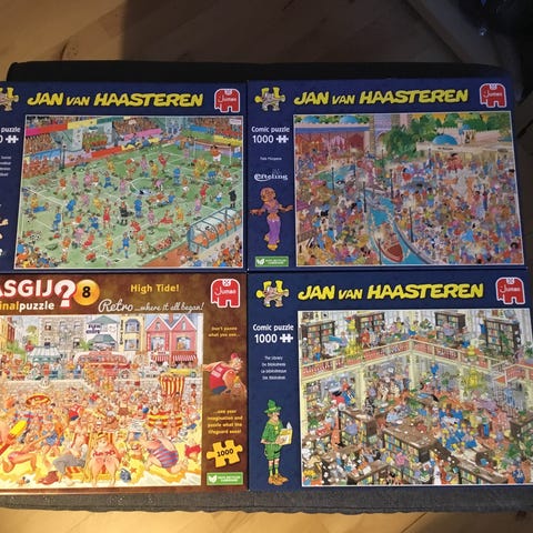 Jan van Haasteren puslespil med 1000 brikker. Motiverne er detaljerede og humoristiske tegninger i farver. Velegnet til puslespilsentusiaster, der kan lide større puslespil med mange små detaljer. Kan bruges enkeltvis eller som samling af flere forskellige motiver.