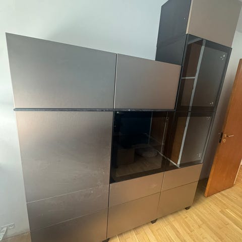 Sælger 4 separate IKEA BESTÅ moduler i mørk trælook. Stilrent og moderne udtryk med elegante messing/guld-farvede ben, som løfter møblerne og giver et eksklusivt look.
