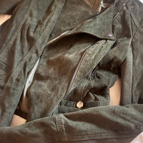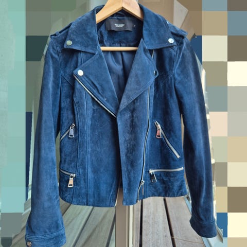Blå og sort læderjakke i str 38 (lille) mange fine detaljer, aldrig brugt.