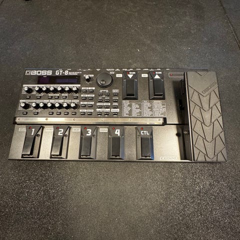 Boss GT-100 multieffekt til guitar. En digital effektprocessor med flere fodkontakter, ekspressionspedal og indbyggede displays til styring af effekter og presets. Enheden har forskellige tilslutninger, herunder guitarindgang, effektloop send/return, udgange, MIDI in/ud samt USB-tilslutning til computer. Velegnet som samlet effektløsning til elguitar i øve- og livesammenhæng samt til optagelse via computer.