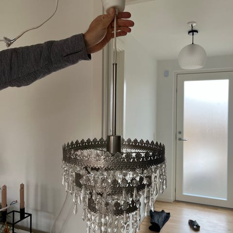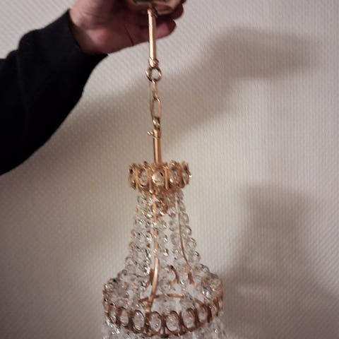 Smuk prisme lampe i sort metal, med mange prismer på. Der er tre lampeholdere til elpærer med lille fatning. Højde lampe er 51 cm, bredde lampe er 37 cm.
