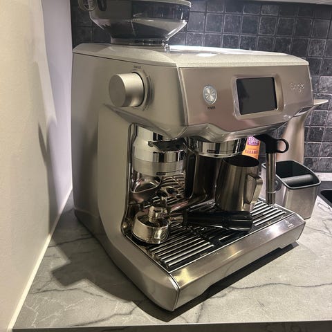 Sage espressomaskine i rustfrit stål med indbygget kaffekværn. Maskinen har dobbelt udløb til brygning af en eller to kopper ad gangen samt damparm til skumning og opvarmning af mælk. Betjeningspanelet har display og knapper til valg af indstillinger og programmer. Øverst er der bønnebeholder og område til opbevaring eller opvarmning af kopper. Medfølgende tilbehør på billederne omfatter blandt andet portafilter, mælkekande, affaldsbeholder, filterkurve, rengøringsdele og brugervejledning. Velegnet til tilberedning af espresso, cappuccino og lignende kaffedrikke i hjemmet.