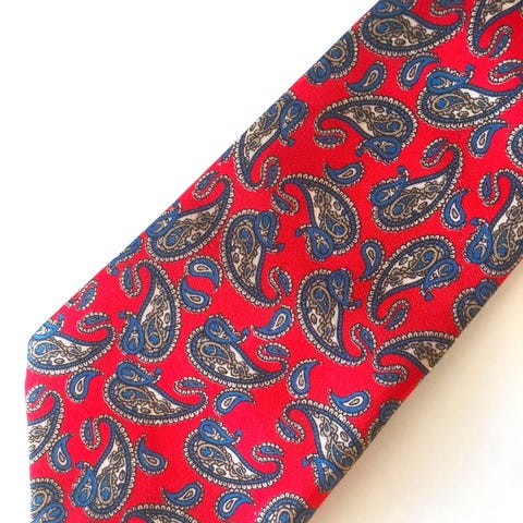 Bowler slips til mand i mørkeblå polyester med paisleymønster i blå og røde nuancer. Slips i klassisk facon, egnet til brug sammen med skjorte og jakkesæt ved både formelle og mere afslappede lejligheder.