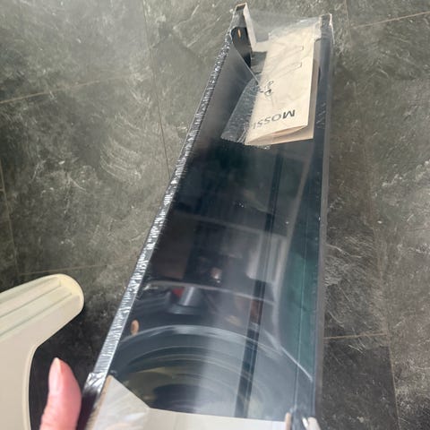 Fin hylde med spejl der kan rykkes frem og tilbage i stort stål