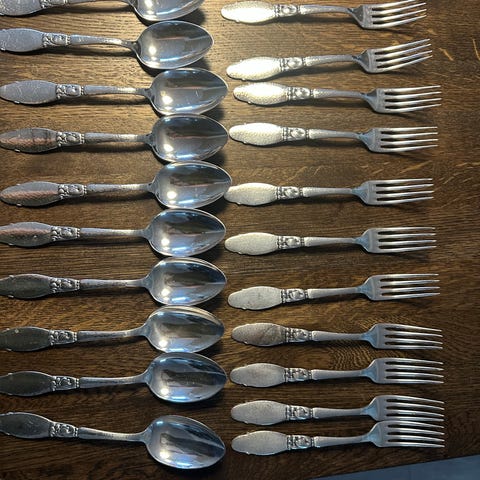 Kommer fra et dødsbo - så aner ikke hvad det er værd Bestikket fremstår med patina og kan bruges som reservedele, supplement til eksisterende stel eller til kreative projekter og dekoration.