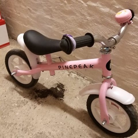 Løbecykel med 12" hjul i grøn. Velegnet som første cykel før overgang til almindelig børnecykel. Altid stået indenfor.