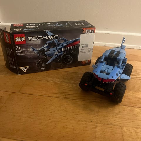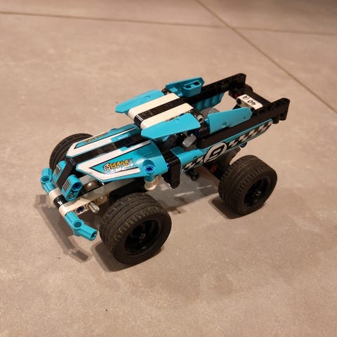 LEGO Technic bil i blå med sorte terrændæk. Modellen er bygget af Technic-elementer med bevægelige dele og detaljeret karrosseri. Egnet til leg eller som del af en LEGO Technic samling.