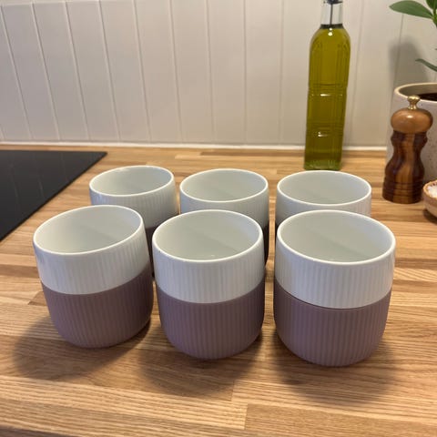6 stk. helt nye Royal Copenhagen kopper i porcelæn med grå og hvid farve. Kopperne har en ribbet overflade og en glat indvendig finish. Velegnet til servering af varme og kolde drikke. Har fået dem i guldbryllups gave, men vi er i en alder hvor man gerne vil have hank på koppen