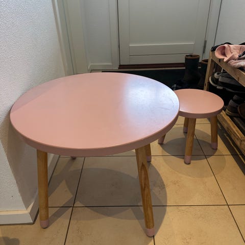 rundt børnebord med tyrkisbordplade og motiv af en slange i grøn med hvide prikker. Bordet har metalstel i hvidt med krydsben og små hjul, som gør det let at flytte rundt. Velegnet som lille bord til børn, for eksempel til leg, tegning eller som sidebord på børneværelset.