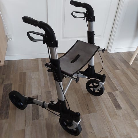 Rollator med sæde i sort metalramme. Udstyret med fire hjul, håndbremser og håndtag med justerbar højde. Rollatoren kan klappes sammen for lettere opbevaring og transport. Egnet som ganghjælpemiddel til voksne, både indendørs og udendørs, på jævnt underlag.