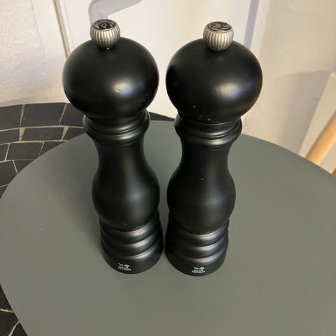 Flot Peugeot salt- og peberkværnssæt med holder lige til at stille på spisebordet uden at det drysser efter brug. Model Paris 18cm høj. Blank lakering.